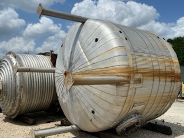 Used 5670 gallon 316L stainless steel vertical single wall vessel. Mfg. by Sovereign Stainless Fabricators in 2006. 45 psig @ 302°F. 1.0 specific gravity. 10' diameter x 7'3" T/T. 14'10" O.A.H. 3/8" thick shell wall. 24" side manway, 3" center bottom outlet, dished heads. On (4) leg supports.