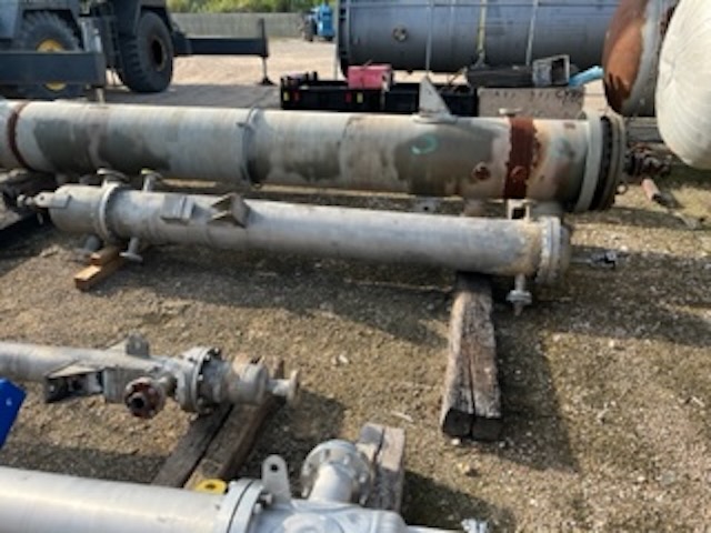 Used 220 sq. ft. 316L stainless steel vertical heat exchanger. Mfg. by Alabama Heat Exchanger in 2006. 14" diameter x 10' F/F. Shell: 316L stainless steel, 145FV psig @ 302°F. Tubes: 316L stainless steel, 145 psig @ 212°F, 112-3/4" od x 16 GA tubes. On (2) lug supports.